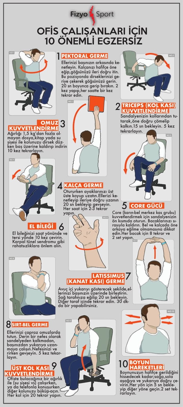 - Üst kol kası kuvvetlendirme: Ofiste bulacağınız bir ağırlık ile( su şisesi gibi) çalışırken, ya da telefonla konuşurken diğer kolunuzu büküp açın. Her kol için 20 tekrar yapın.